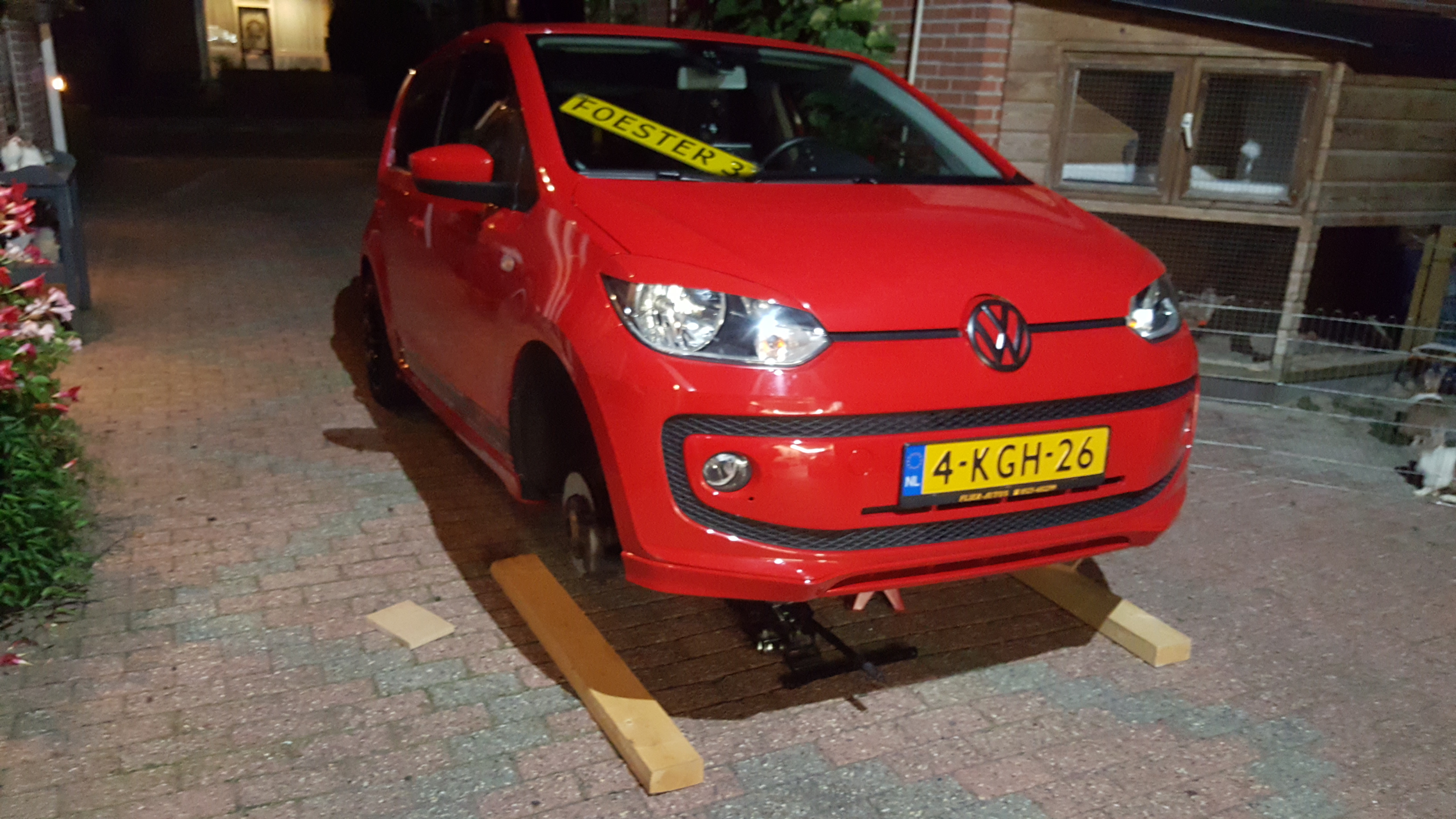 Ik zat al een tijdje met het idee om de remklauwen een mooi kleurtje te geven, begin augustus heb ik een setje hiervoor gehaald waar alles in zit. Handschoenen, remmenreiniger, staalborstel en natuurlijk de verf. Sindsdien was het zoeken naar een moment dat ik het ook kon uitvoeren, toevallig had ik afgelopen vrijdag vrij. Dus donderdagavond de Up! op poten gezet en de wielen eraf gehaald. De volgende morgen de klauwen schoongemaakt en geverfd. Vervolgens 's middags de achterkant omhoog gehaald om de remtrommels zwart te spuiten. Tevens heb ik de wielkasten, velgen en remmen schoongemaakt. Zaterdag de remtrommels gespoten en alles weer op de auto gedraait.