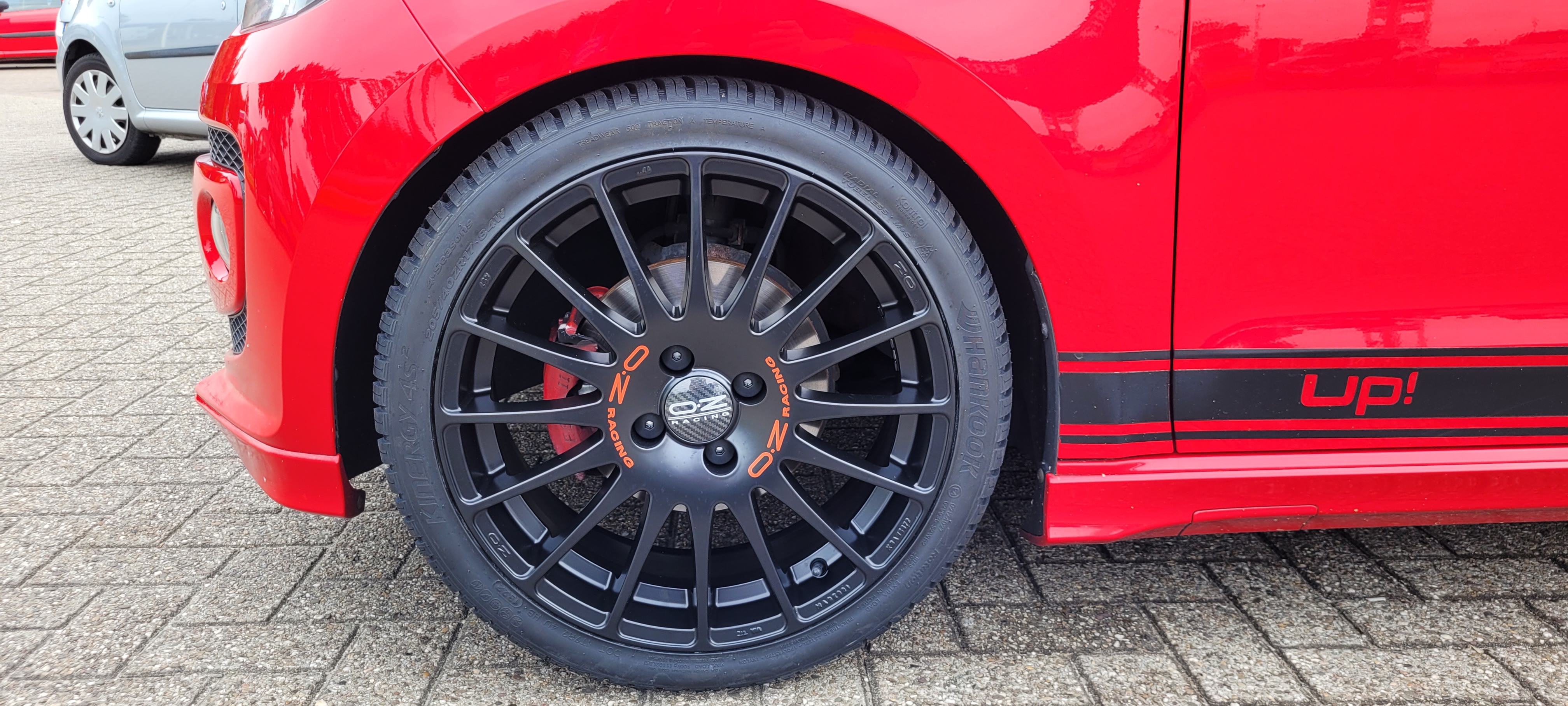 VW HIGH UP! 44KW/60PK rouge: geblindeerde ramen, Xenon projector verlichting, LED achterlichten, achterspoiler, diffusor, uitlaatsierstuk, instaplijsten, zijwindschermen, blacked out front en back, 17'' OZ Superturismo GT matt black.