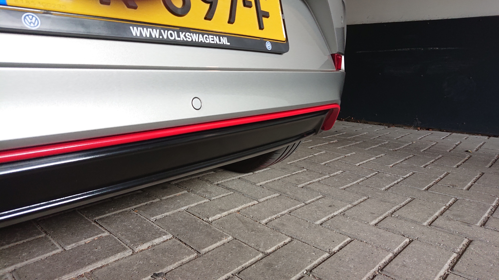 Het aanzetstuk van de achterbumper netjes afgewerkt en tevens Tornado-Rood aangebracht, is exact dezelfde kleur als de GTI badges. Ik ben tevreden