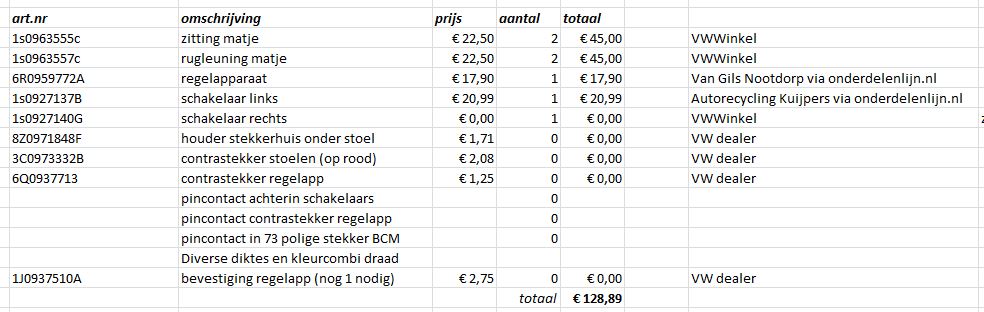 De belangrijkste en kostbaarste onderdelen heb ik inmiddels aangeschaft, zie foto en tabel. Vermoedelijk kom ik uiteindelijk op ca 170 euro uit aan kosten, hoeveelheid uren is nog even afwachten :D Heb ook wel mazzel gehad, de rechter schakelaar die ontving (voor € 10 oorspronkelijk) had een klein defect, daarom moet ik een stukje van mijn huidige schakelaar overzetten en ik ontving zonder morren het aankoopbedrag daarvan terug. Mijn oude schakelaar wordt na het overzetten ook onverkoopbaar natuurlijk, voor zover daar uberhaupt kopers voor zijn. Maar daarom staat de rechterschakelaar dus nu voor € 0 in het lijstje. Ik wil sowieso even een pluim geven aan VWWinkel voor de contacten en afhandeling.