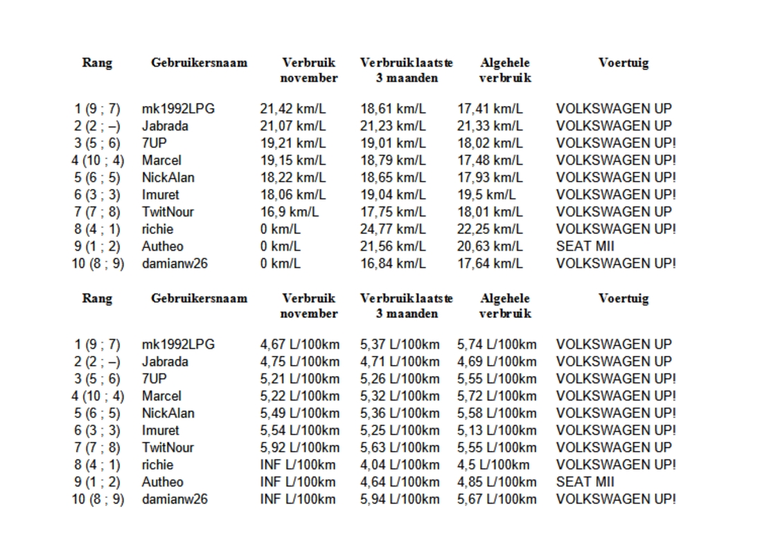 Hieronder het overzicht van november, met weer wat verschuivingen. Tja, als je zo weinig rijdt dat je niet tankt, keldert de enige Mii in het rijtje zomaar van plek 1 naar plek 9...