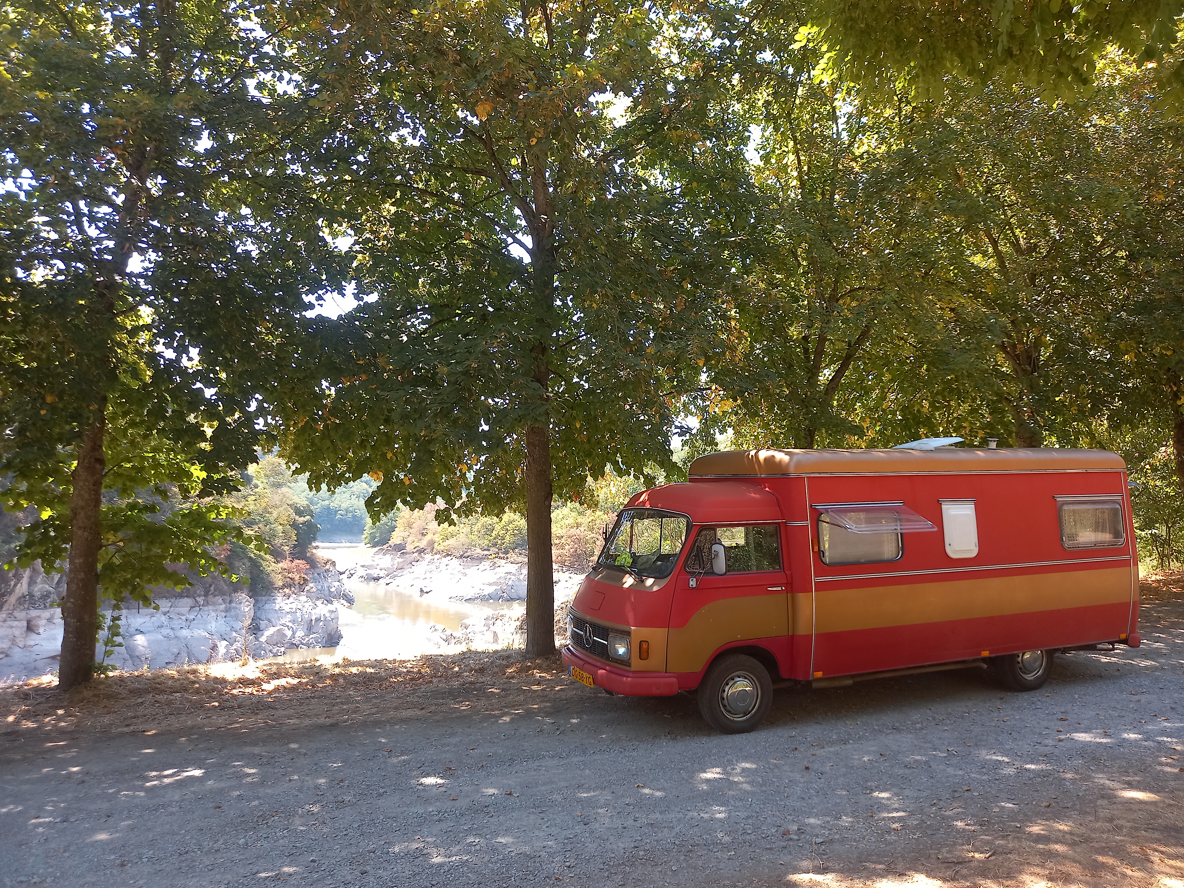 We hebben onze tocht voortgezet via Centraal Frankrijk en een keer overnacht bij het exacte geografische midden van de twaalf staten van de EU, dat na de val van de Berlijnse muur kwam te liggen bij Saint Clément. We stonden daar heerlijk koel en in de schaduw naast een riviertje, best welkom tijdens de hittegolf van meer dan 37 graden. Vooral als je stilstaat, is de schaduw wel lekker. Ondanks de hitte was het tijdens het rijden heel goed uit te houden, dankzij de kleine klapraampjes in de voordeuren die als deflector dienen waardoor de rijwind je heerlijk verkoelt. Op die manier heb je geen airco nodig!