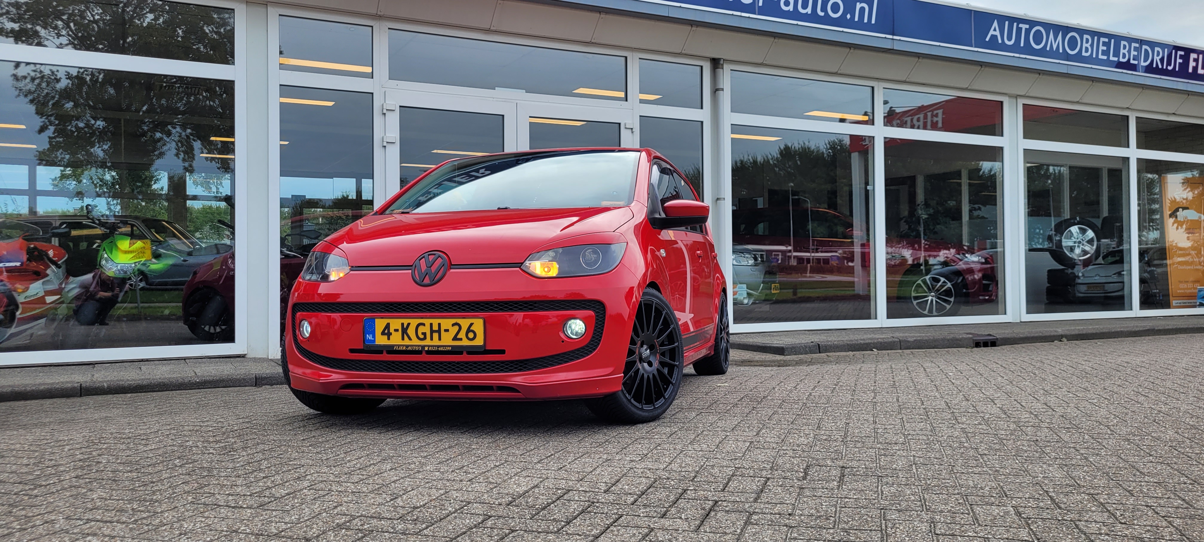 VW HIGH UP! 44KW/60PK rouge: geblindeerde ramen, Xenon projector verlichting, LED achterlichten, achterspoiler, diffusor, uitlaatsierstuk, instaplijsten, zijwindschermen, blacked out front en back, 17'' OZ Superturismo GT matt black.