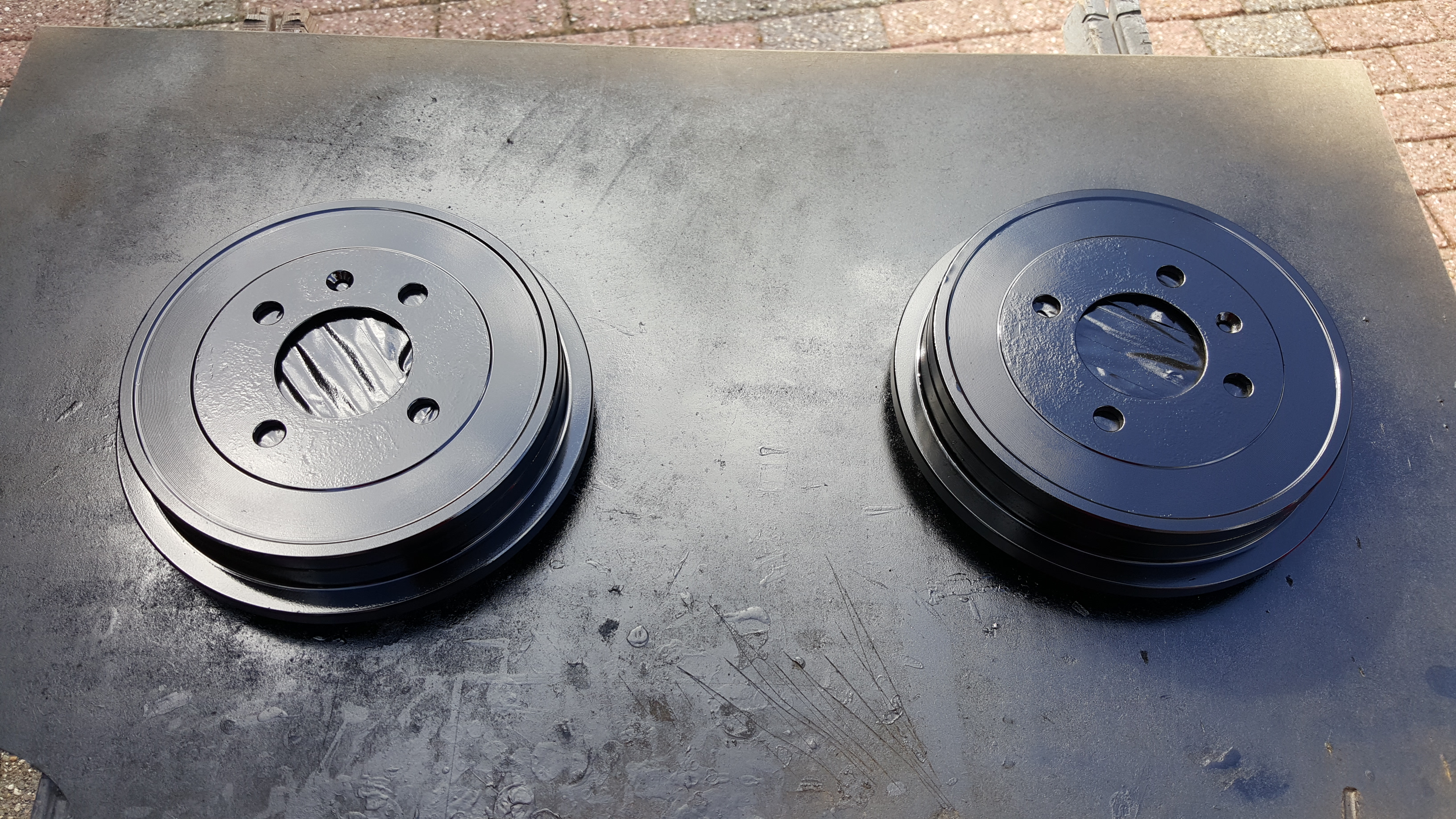 Ik zat al een tijdje met het idee om de remklauwen een mooi kleurtje te geven, begin augustus heb ik een setje hiervoor gehaald waar alles in zit. Handschoenen, remmenreiniger, staalborstel en natuurlijk de verf. Sindsdien was het zoeken naar een moment dat ik het ook kon uitvoeren, toevallig had ik afgelopen vrijdag vrij. Dus donderdagavond de Up! op poten gezet en de wielen eraf gehaald. De volgende morgen de klauwen schoongemaakt en geverfd. Vervolgens 's middags de achterkant omhoog gehaald om de remtrommels zwart te spuiten. Tevens heb ik de wielkasten, velgen en remmen schoongemaakt. Zaterdag de remtrommels gespoten en alles weer op de auto gedraait.