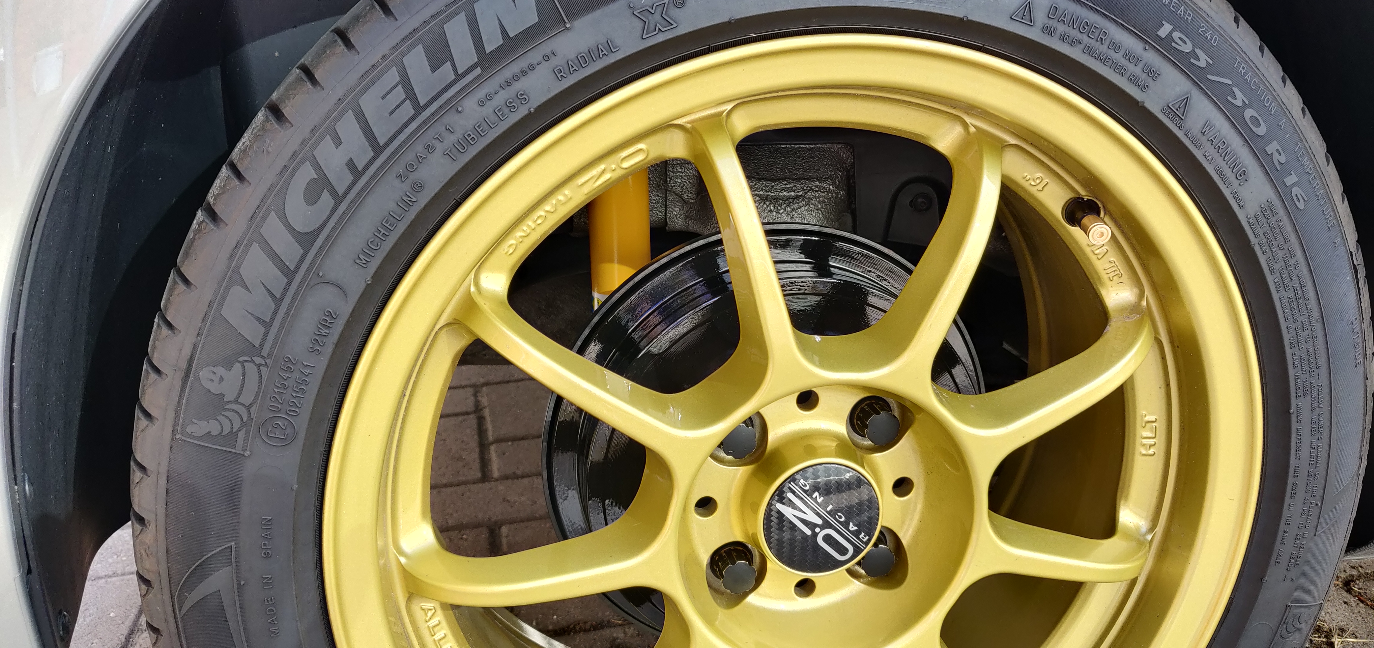 +OZ-RACING Alleggerita HLT in race gold 7x16 ET 37 met nog goede Michelin primacy 3 195/50 (5a6 mm profiel) +20 Jr-wheels slotbouten met adapter (dit is alleen al bijna €2000,- )