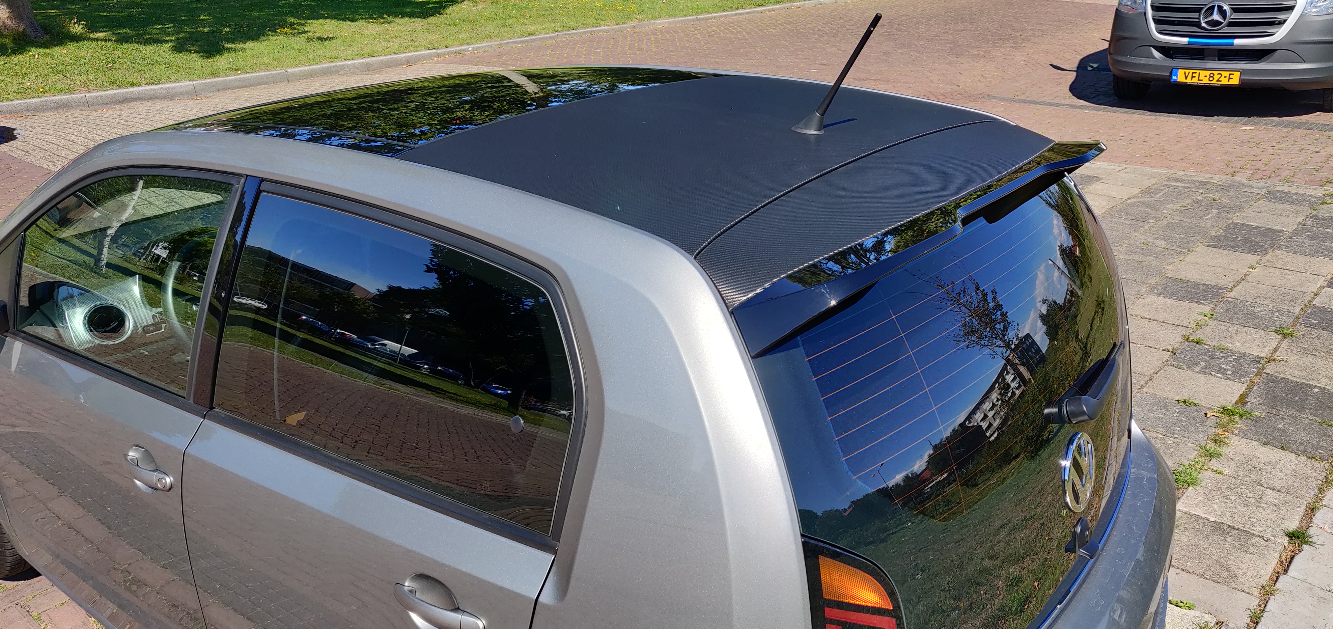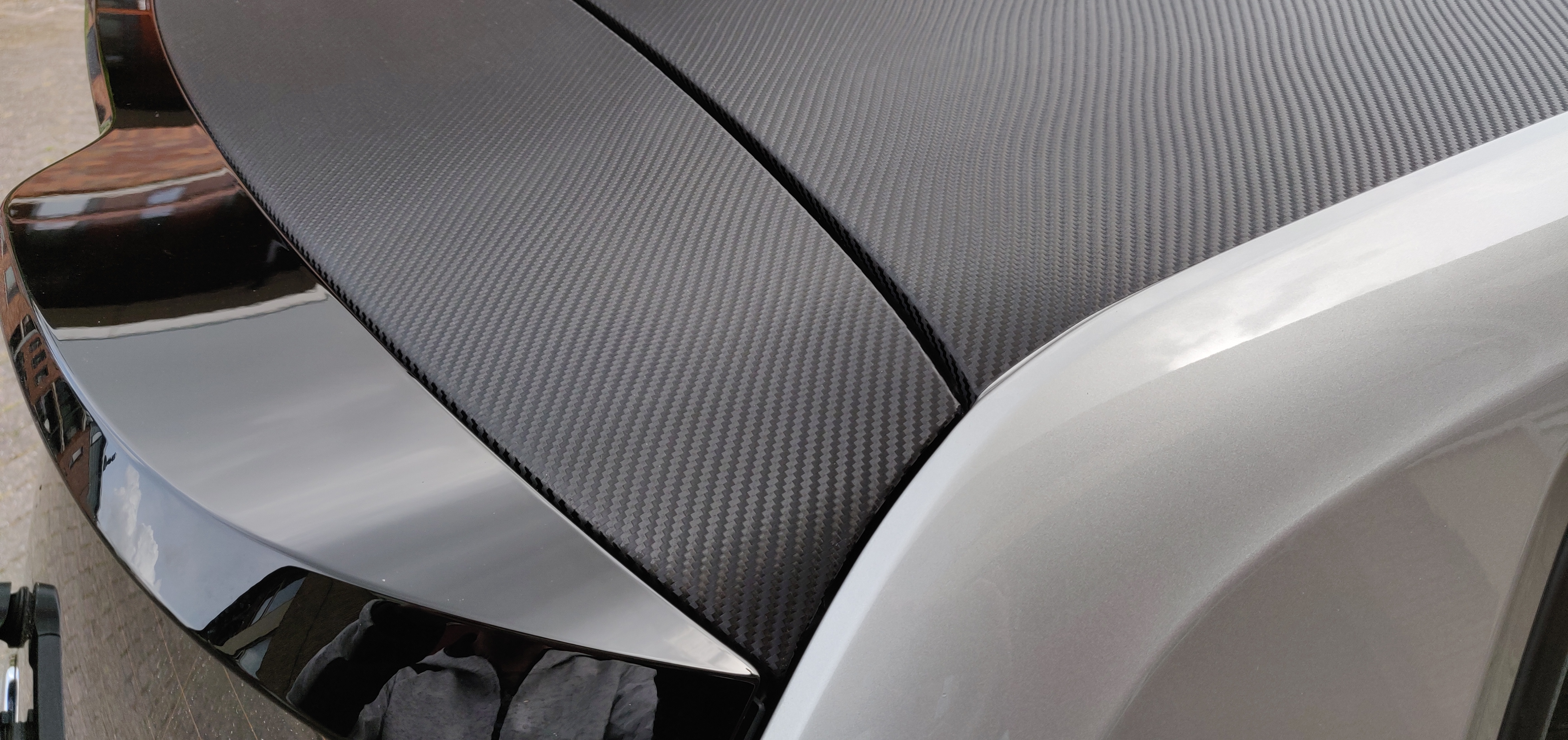 # stukje dak achter het panoramadak plus randje achterklep laten wrappen in carbon-print (weet niet of 't een blijvertje is)