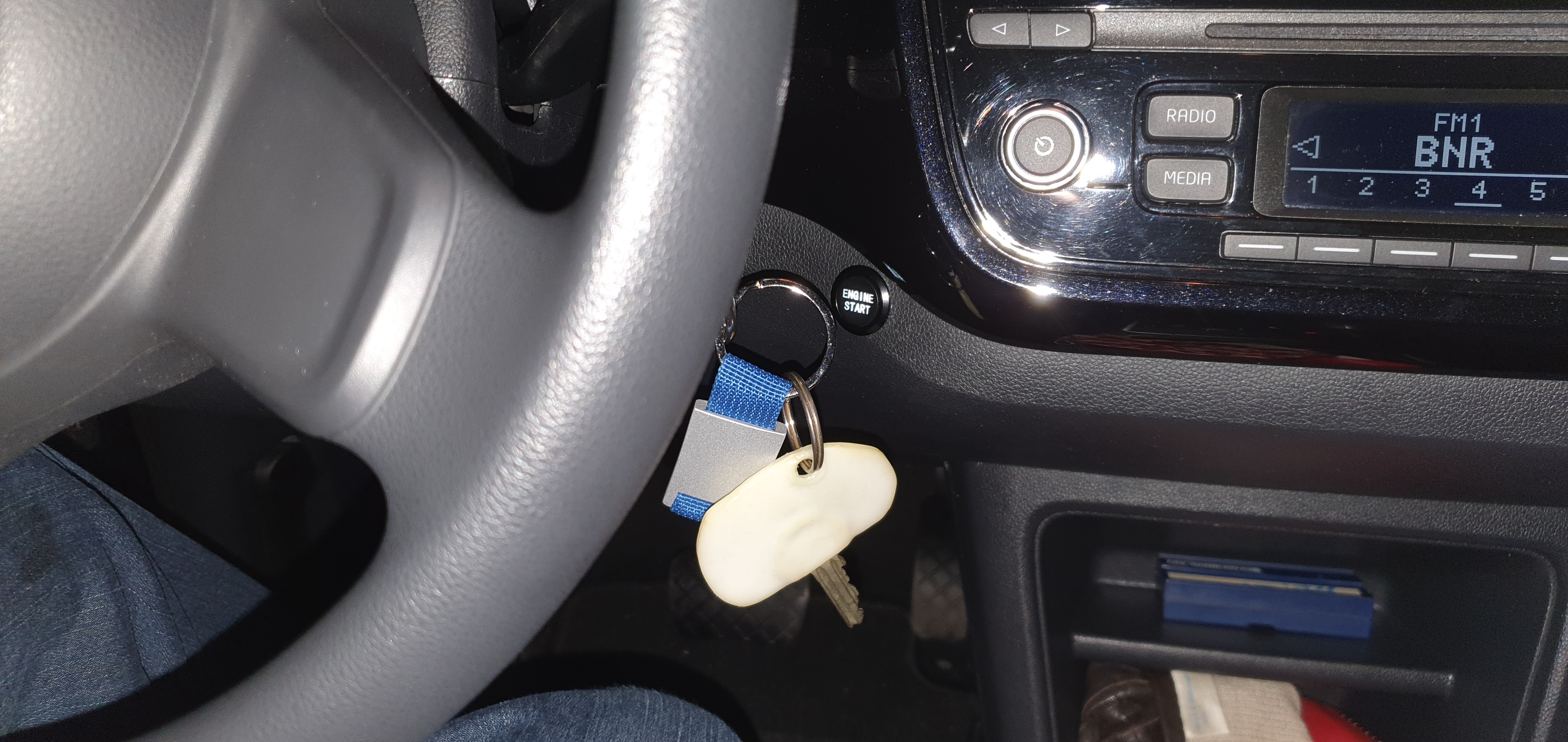 De sleutel kun je gewoon gebruiken als vanouds. Met de sleutel ontgrendel je het stuurslot en zet je de auto op contact. In plaats van doordraaien naar starten druk je nu de startknop in om te starten. Dat doe je tot de motor aanslaat. Als je de motor wil uitzetten doe je dat zoals altijd door de sleutel terug te draaien. Het enige verschil is, dat je als de motor draait, niet op de startknop moet drukken, omdat de startmotor dan weer gaat draaien. Bij de sleutel zit daar een beveiliging op: als de motor draait kun je de sleutel niet doordraaien naar starten. Je moet dan immers eerst terug naar 0 voordat je opnieuw kunt starten. Duidelijk?