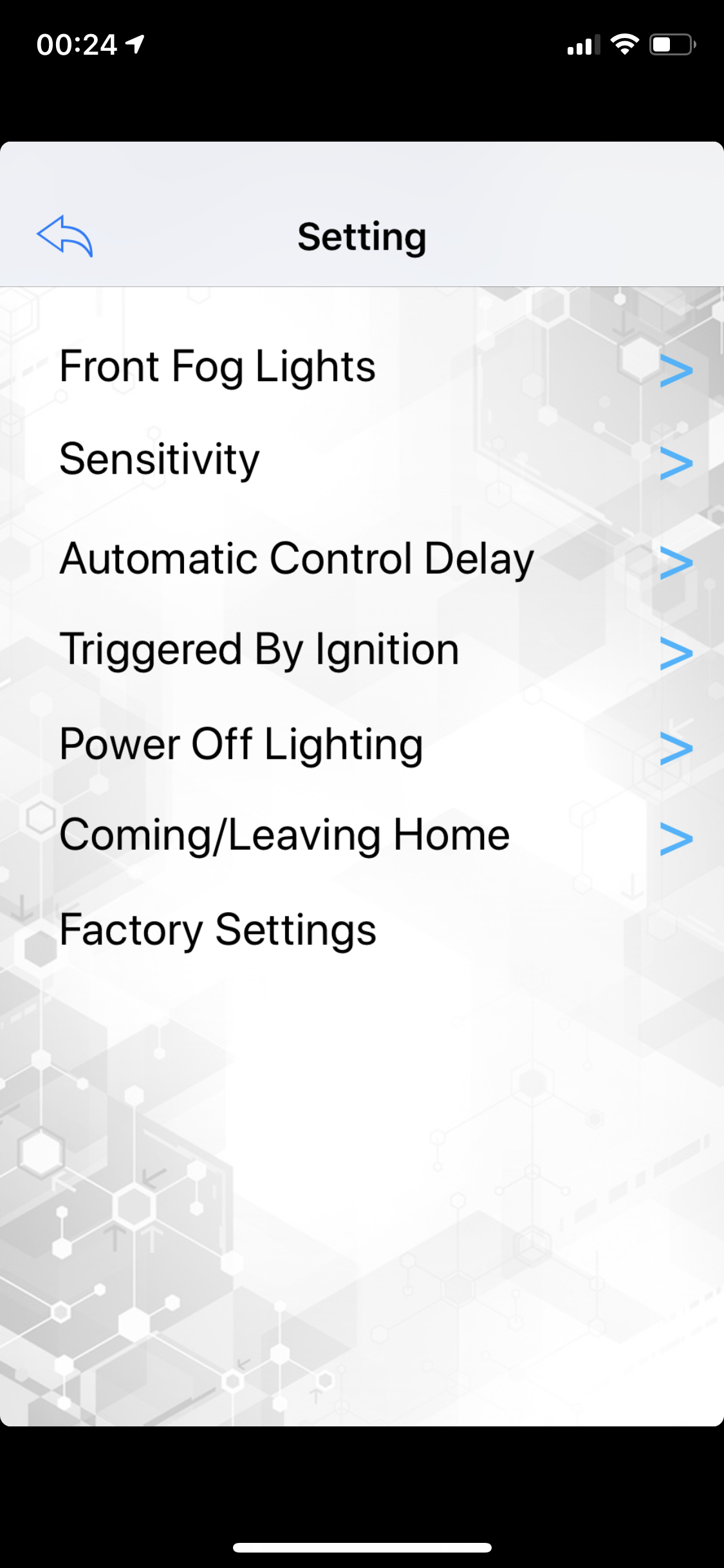 Power off lightning: Eigenlijk de coming home functie. Hier stel je in hoeveel seconden de lichten moeten blijven branden als je op de plek van bestemming bent aangekomen, nadat je het contact uit hebt gezet. Je kunt kiezen of je dit via het dimlicht of het stadslicht wilt activeren, of zelfs beide. Mistlichten is helaas niet mogelijk.