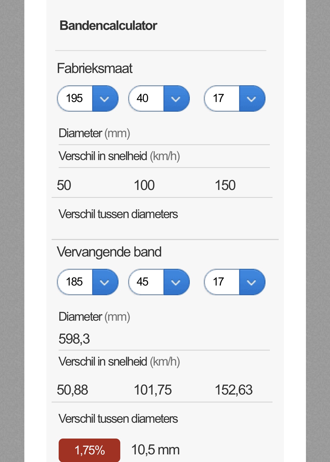 Wel een maatje smaller zo te zien. Hier de omreken tabel voor deze maat t.o.v. de originele;Emiel25 schreef: ↑za 02 feb 2019, 19:43Een veel voorkomende klacht over de Up GTI is de stugheid van de auto (o.a. door r17/195/40 banden) en de slechte conti’s. Op de Engelse facebook zie ik iemand die er 17 inch op heeft liggen met een wang van 45. Dat kan blijkbaar. Dat wil ik ook wel doen, maar kan dat zo maar? Waar loop ik mogelijk tegenaan? Wat vinden jullie?