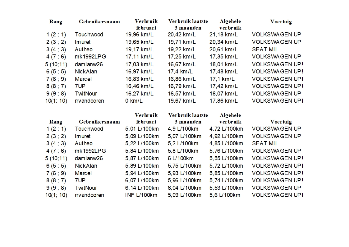 Om eerlijk te zijn denk ik dat jij vergeleken met de top 3 in verhouding nog wel eens minstens net zo zuinig of zelfs zuiniger rijdt dan nu lijkt. Want jouw liters gaan dacht ik over LPG, en daar wordt van gezegd dat door de lagere verbrandingswaarde je tussen 10 en 15% meerverbruik hebt. Als je jouw verbruikscijfers daarmee corrigeert, kom je deze maand tussen de 5,1 en 5,3 l/100 km of tussen 1 op 20,1en 19,0 km, als ik me niet verreken.