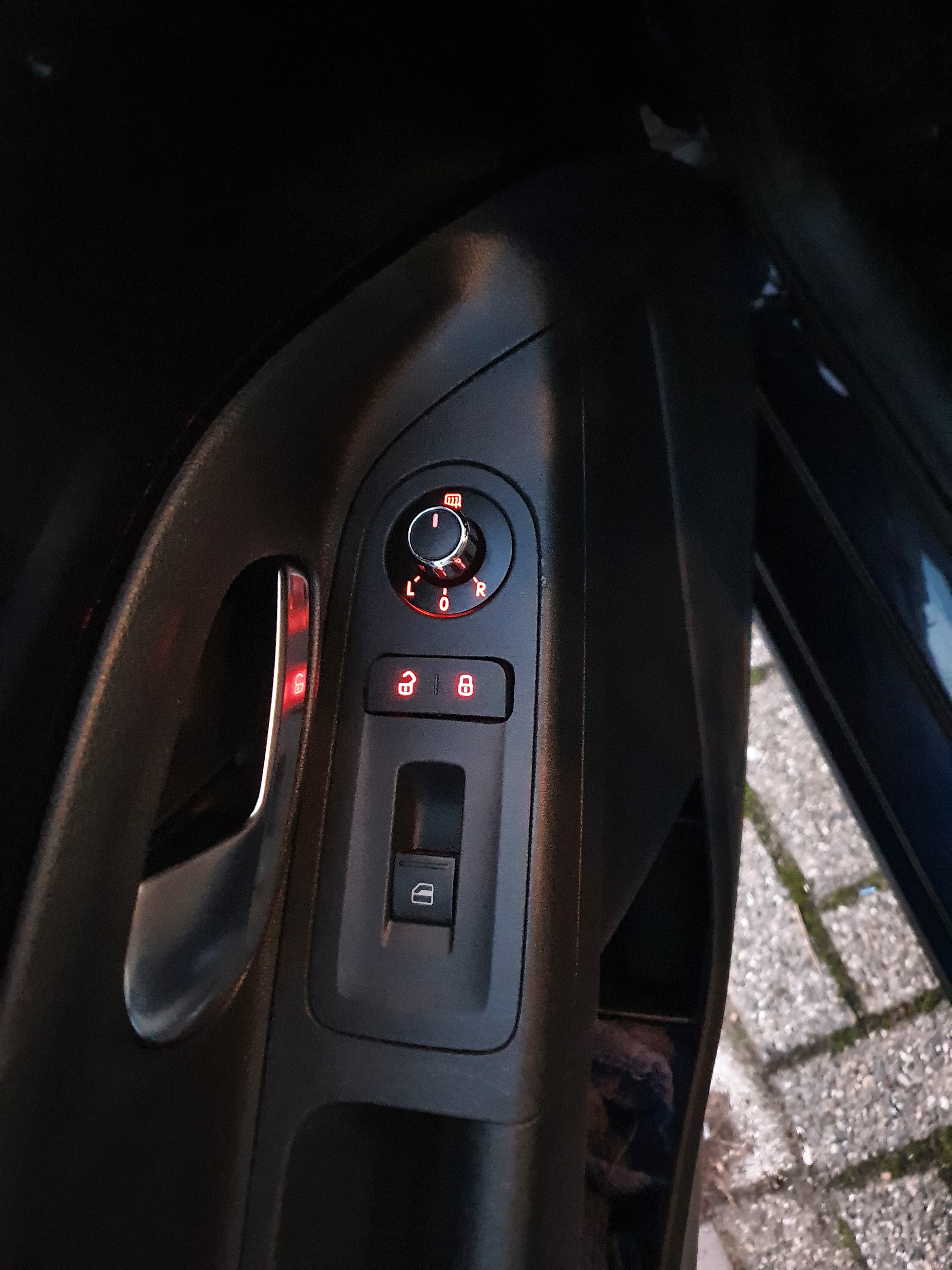 Inmiddels bedrading voor knoppenverlichting en knipperlicht spiegels gelegd in beide deuren en in auto, en eerste knopje met verlichting geplaatst.