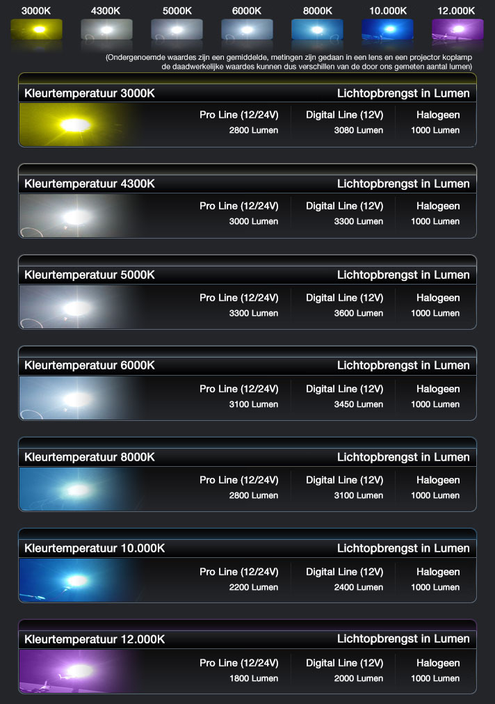 Zal een plaatje bijvoegen over kleurtemperatuur van lampen, misschien heb je er iets aan. Mijn H4 is bijvoorbeeld 5800 kelvin, dat benaderd daglicht, zie foto...