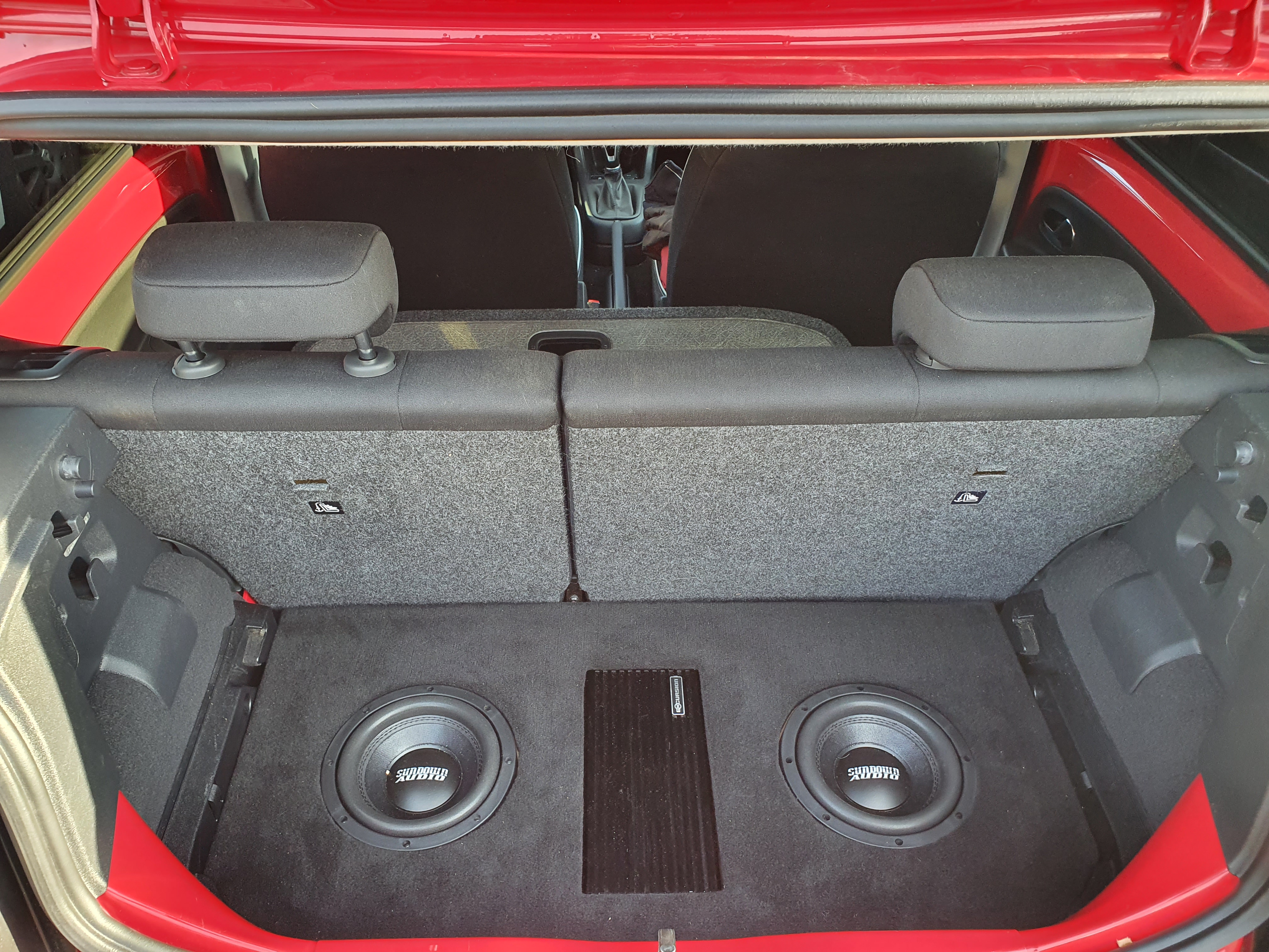 En de per toeval gevonden FR velgen. Originele radio vervangen voor een Alpine headunit. En in de kofferbak 2 x 8" subwoofers Verder de stadslichten (DRL) oranje gemaakt, het plan is om de knipperlichten dezelfde kleur te geven en deze aan te sluiten op een US module.