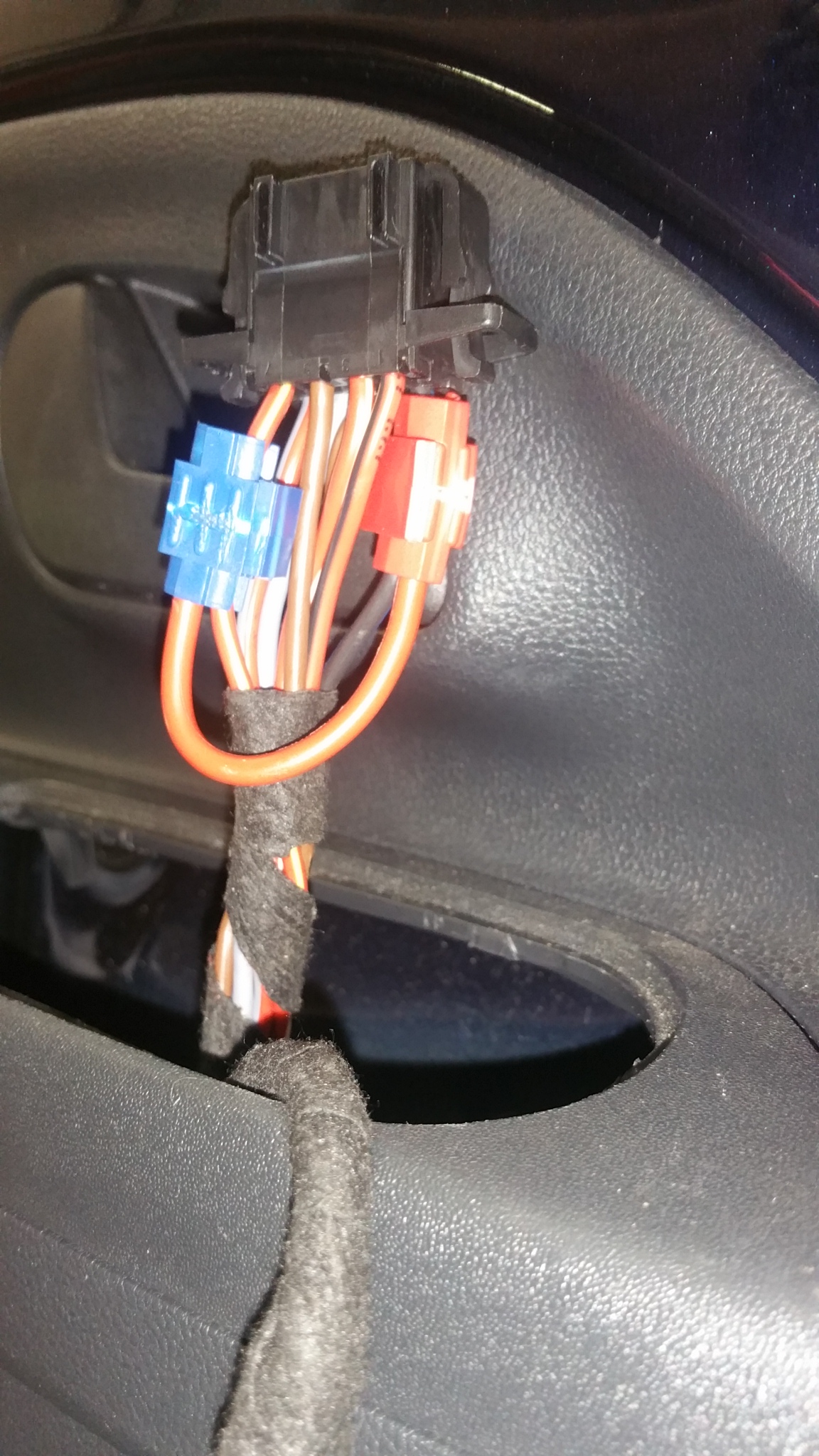 Het is naast het vervangen van de kabelbomen in de deuren, en het leggen (bijtrekken onder het dashboard) van 2 draden van de 28 pins (polig) connectoren/stekkers, bestuurders portier naar bijrijders portier, pin 28<>28 en 27<>27 (zie foto 2) aanleggen van links naar rechts! de 8 extra 4x vrouw 4x man, stekkers (amp) die je nodig heb, heb ik gehaald bij Vag Techniek in Nuenen.