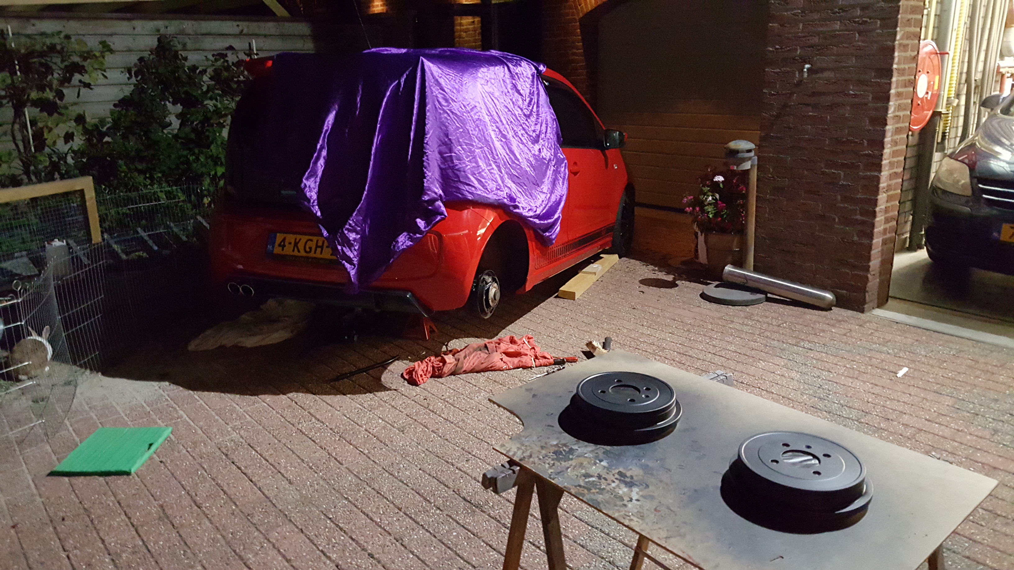 Ik zat al een tijdje met het idee om de remklauwen een mooi kleurtje te geven, begin augustus heb ik een setje hiervoor gehaald waar alles in zit. Handschoenen, remmenreiniger, staalborstel en natuurlijk de verf. Sindsdien was het zoeken naar een moment dat ik het ook kon uitvoeren, toevallig had ik afgelopen vrijdag vrij. Dus donderdagavond de Up! op poten gezet en de wielen eraf gehaald. De volgende morgen de klauwen schoongemaakt en geverfd. Vervolgens 's middags de achterkant omhoog gehaald om de remtrommels zwart te spuiten. Tevens heb ik de wielkasten, velgen en remmen schoongemaakt. Zaterdag de remtrommels gespoten en alles weer op de auto gedraait.